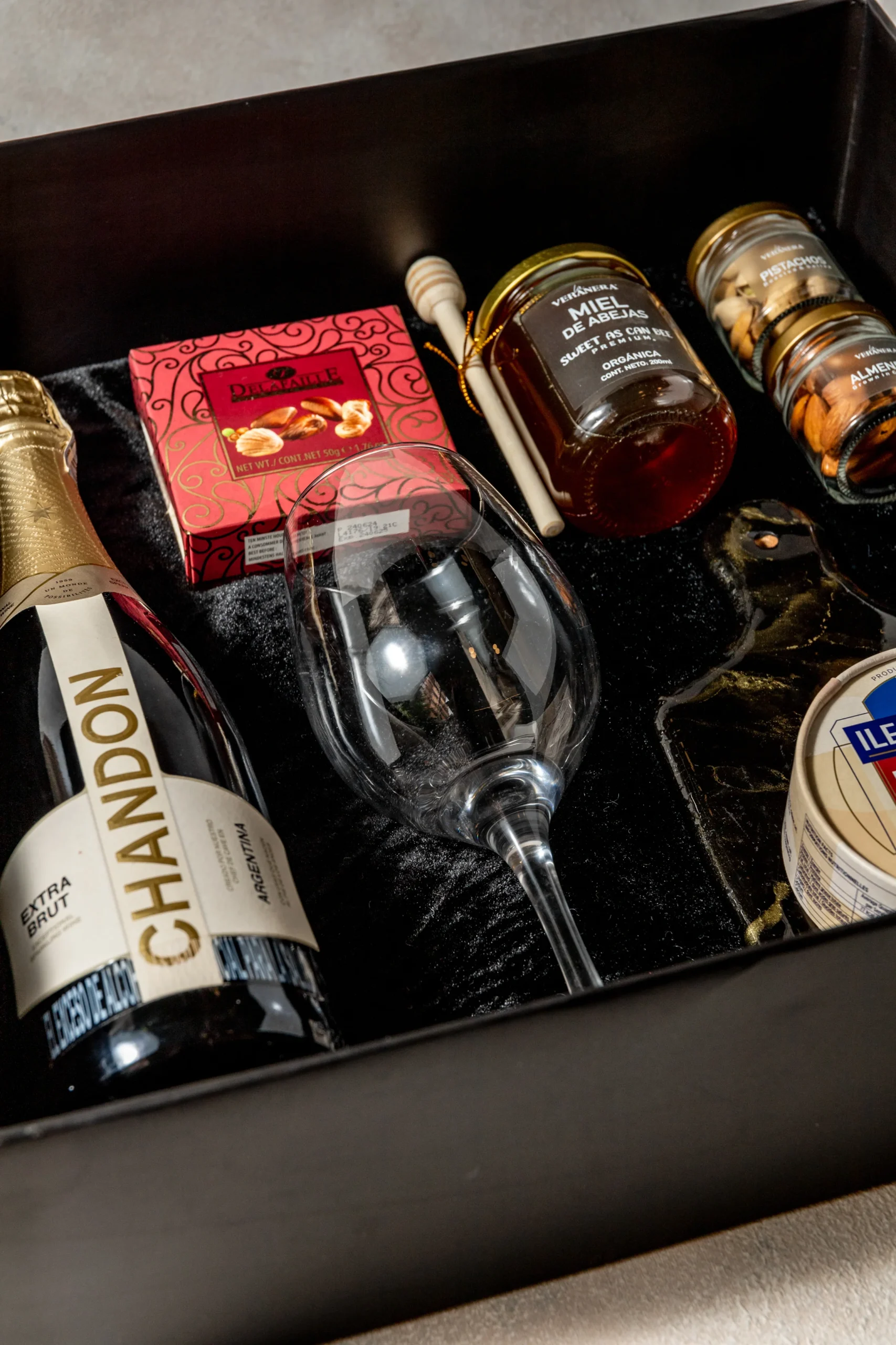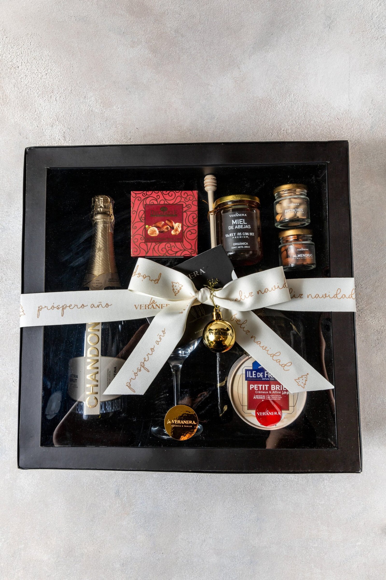 La experiencia se complementa con finos bombones de chocolate belga, una copa de vino y una exclusiva tabla decorativa en resina que realza la presentación. Incluye queso Ile de France Brie acompañado de miel de abejas orgánica, pistachos y almendras que equilibran sabores suaves y delicados. Se finaliza con tarjeta personalizada, moño y esfera decorativa, convirtiéndolo en un regalo sofisticado y memorable.