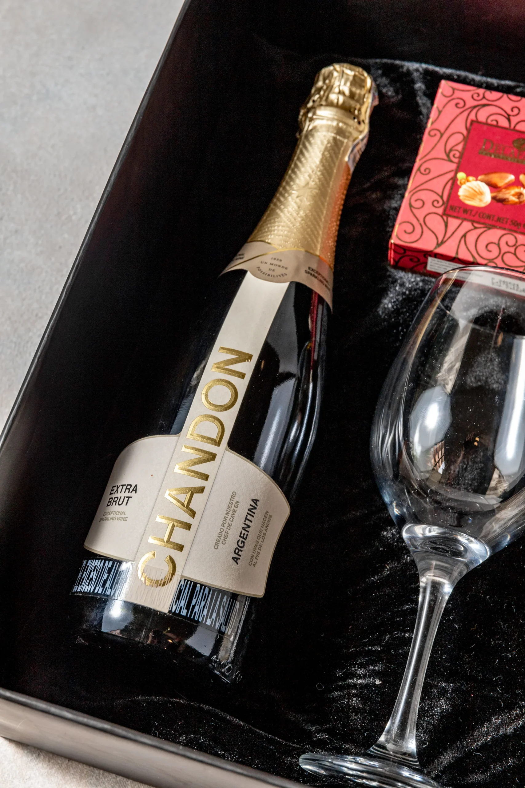 Vino o champaña a elección con queso brie, chocolates belgas, frutos secos y presentación de lujo con copa y tarjeta personalizada. Una experiencia elegante para celebrar y sorprender.