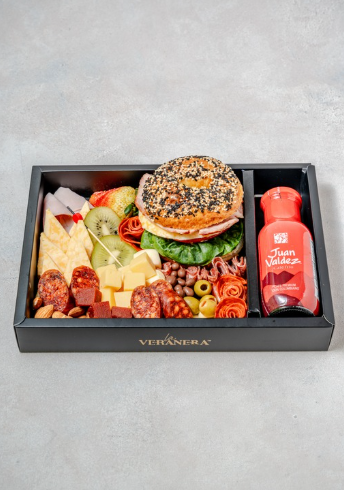 Bagel a elección con café Juan Valdez o jugo de naranja, acompañado de selección de quesos, embutidos y fruta fresca. El combo perfecto para empezar el día.