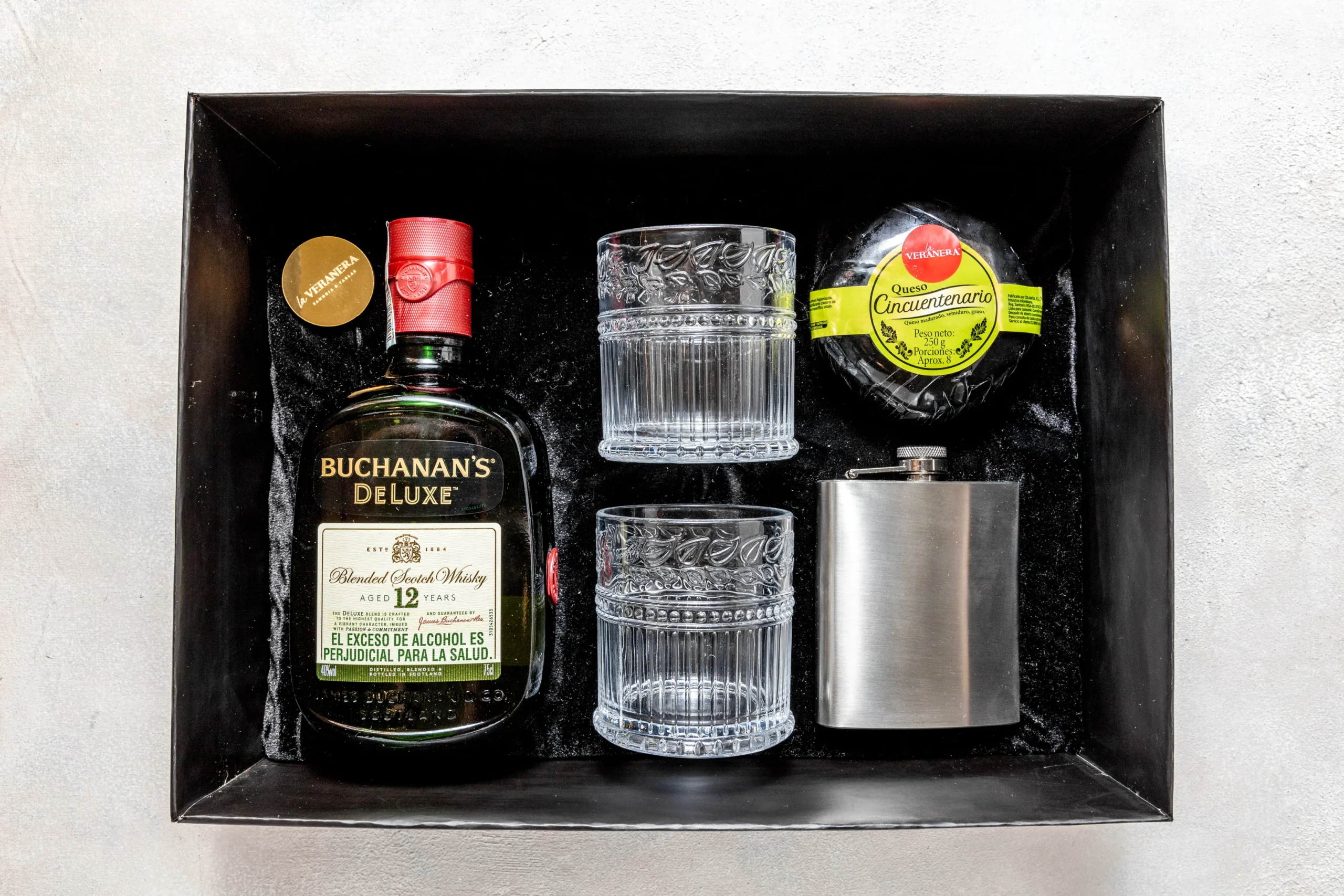 La presentación incluye vasos de lujo y una elegante licorera en acero, acompañados de un exclusivo queso madurado cincuentenario que aporta carácter y distinción a la experiencia. Se complementa con tarjeta personalizada, moño y esfera decorativa, convirtiéndolo en un detalle perfecto para celebraciones importantes, regalos corporativos o momentos verdaderamente memorables.