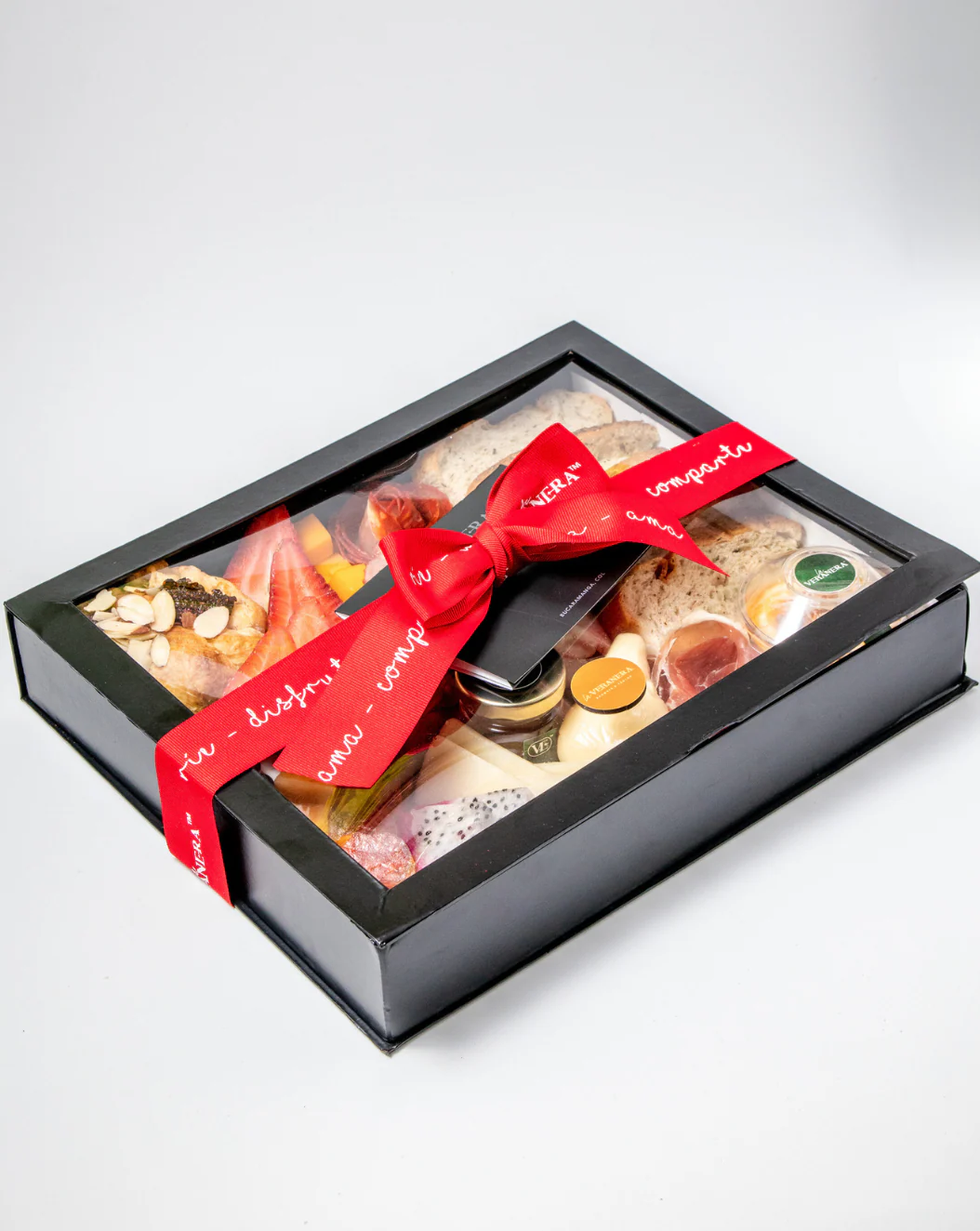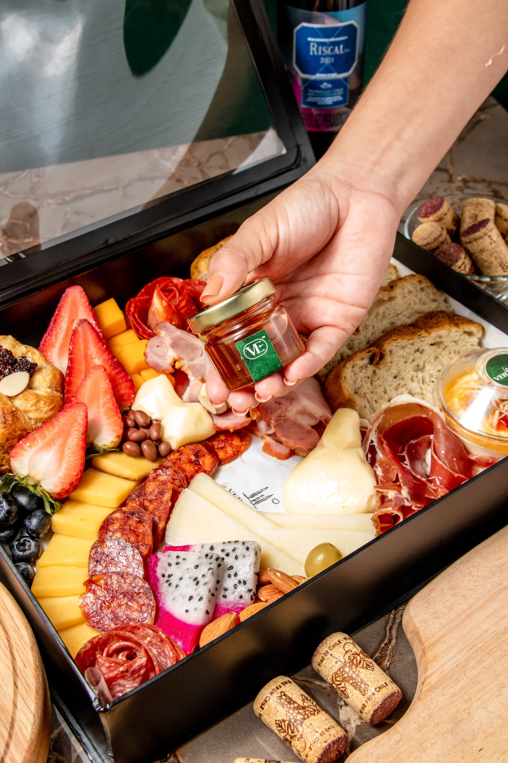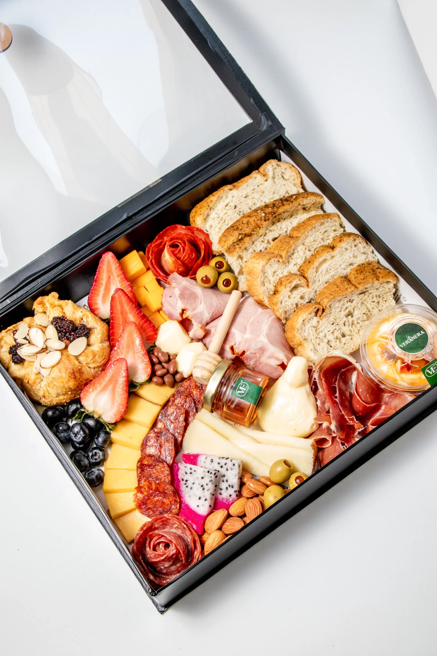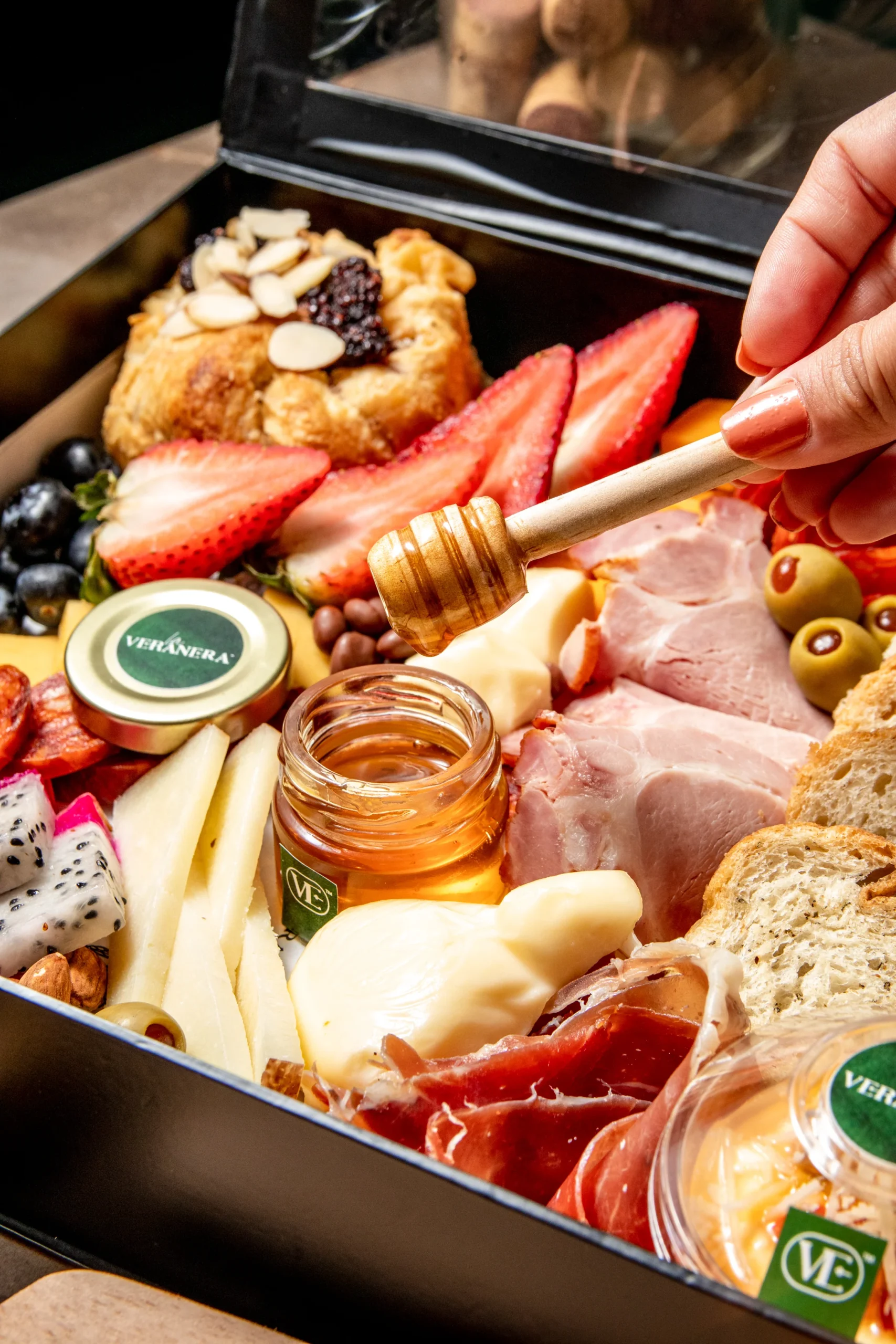 Se complementa con pan de masa madre y nuestro dip de la casa, además de almendras, aceitunas, miel de abejas, fresas y arándanos, aportando frescura y contraste. El toque especial lo da su fondue en masa de hojaldre y los nibs de chocolate, todo presentado en una caja de lujo con tarjeta personalizada, ideal para sorprender y celebrar con estilo.