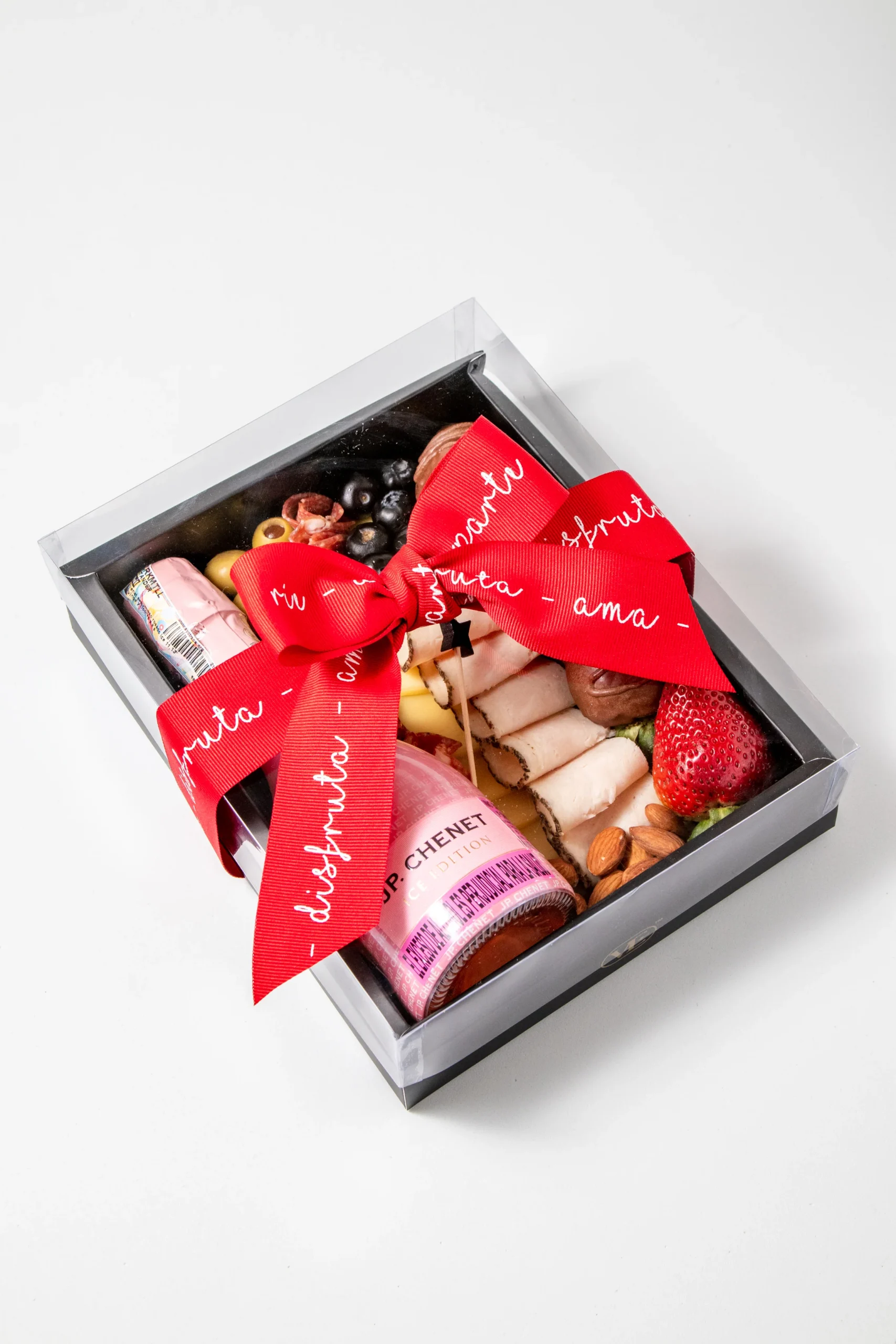 Tabla con JP Chenet 200 ml, selección de quesos y carnes frías, frutas y frutos secos, con tarjeta personalizada. Ideal para regalar o disfrutar.