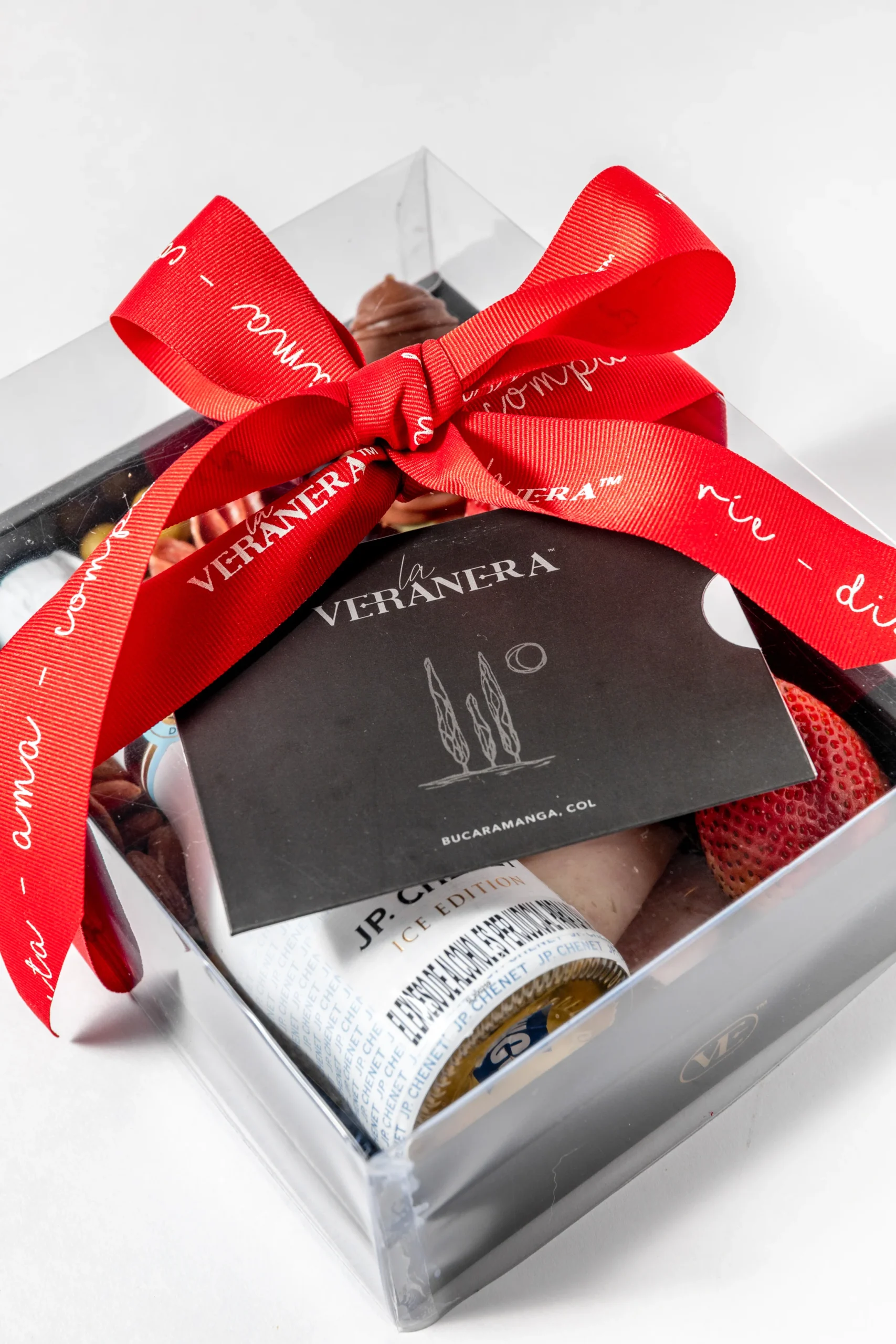 Se complementa con aceitunas, fresas, arándanos y almendras, aportando frescura y textura a la experiencia. Incluye tarjeta personalizada, convirtiéndola en un detalle ideal para regalar, celebrar o disfrutar un momento especial.