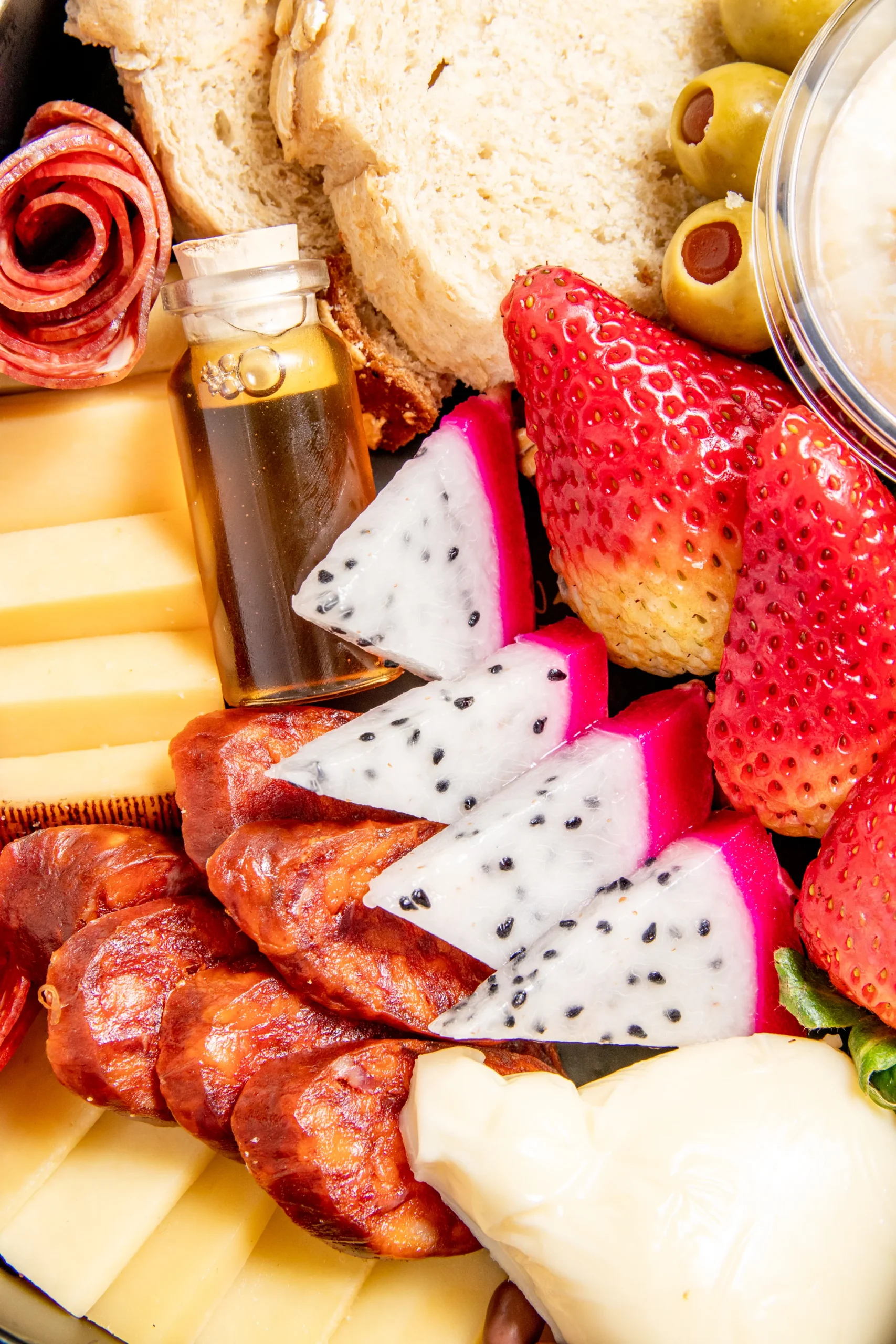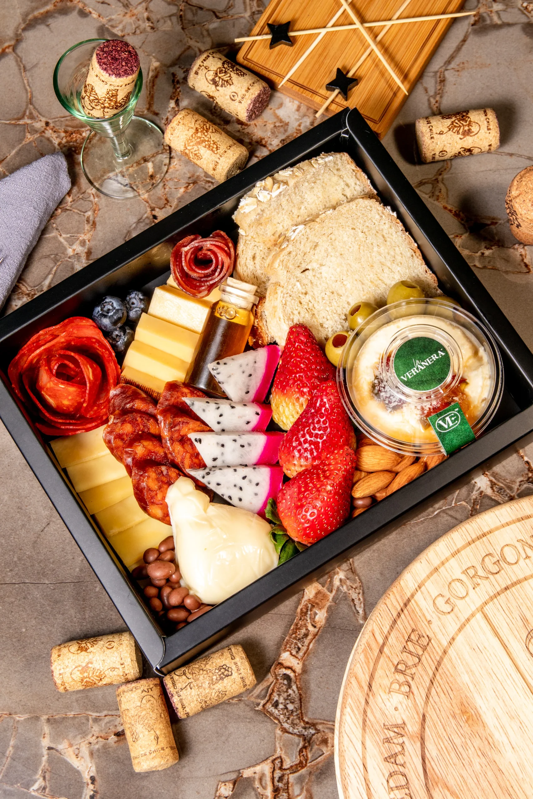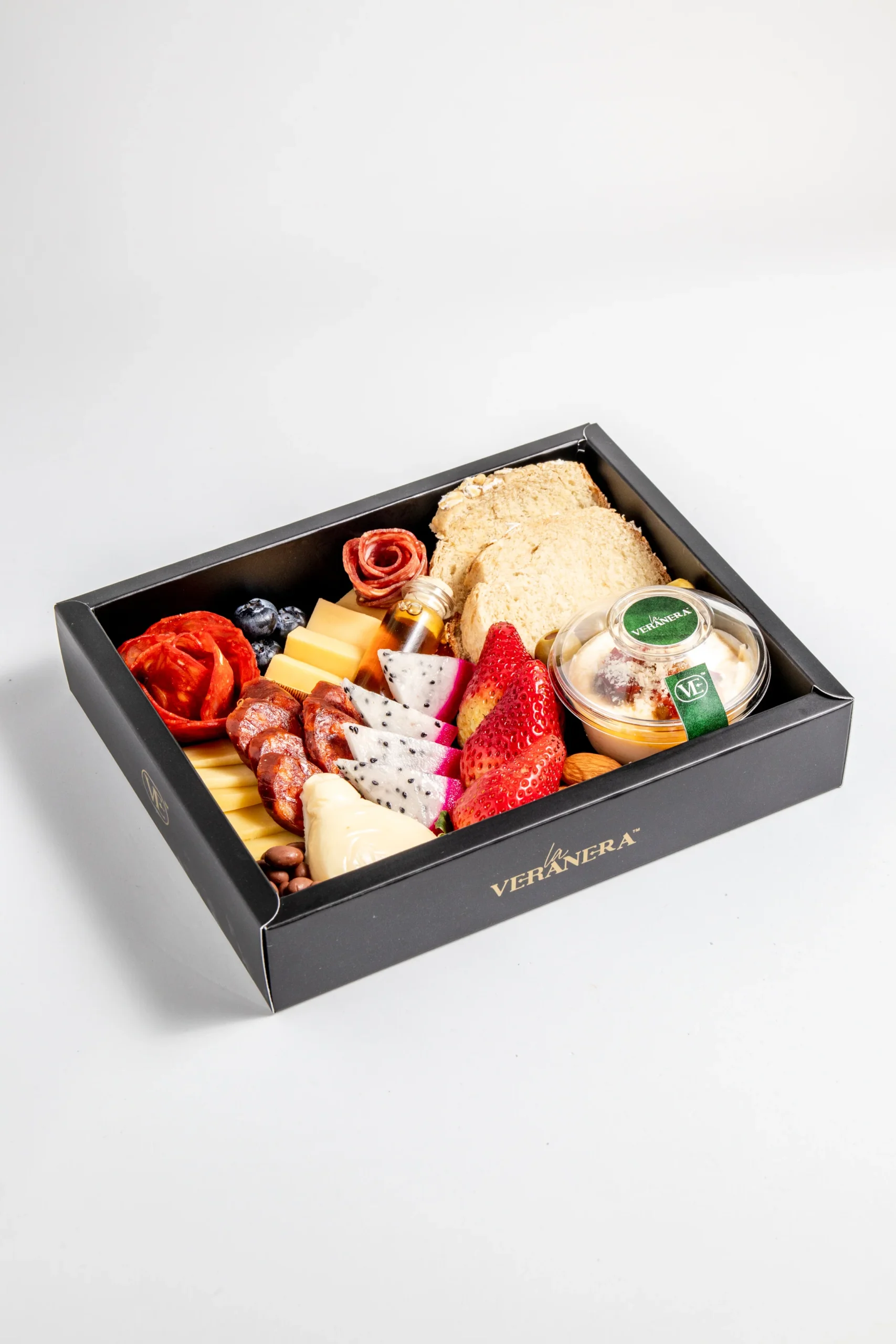 Se complementa con pan de masa madre y nuestro dip de la casa, junto a almendras, aceitunas, fruta fresca, miel de abejas y nibs de chocolate, aportando contrastes dulces y salados que enriquecen la experiencia. Incluye tarjeta personalizada, convirtiéndola en una opción ideal para regalos, celebraciones o momentos especiales.